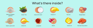 It has Taurine, Hyaluronic Acid, Vitamins A, C, E, Biotin, Antioxidants Grape seed & Green Tea extracts for enhancing benefits of Collagen.